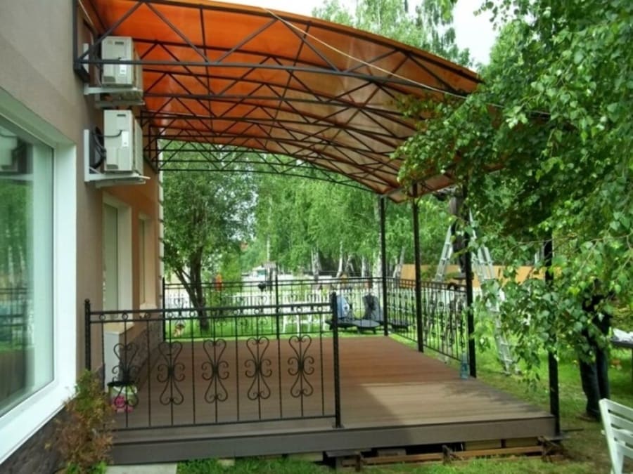 Открытая парковка у частного дома, крыльцо, балкон, уличный бассейн, зона для барбекю, цветник с нежными сортами, переходы между домом и хозяйственными постройками – мест и объектов, которые желательно, а то и обязательно нужно защищать от атмосферных осадков и солнца предостаточно. И потому фабричные и самодельные навесы из поликарбоната приобретают все большую популярность. Этот материал является хорошей альтернативой металлу, пластику и дереву, плюс имеет некоторые особенности, которых нет у других.